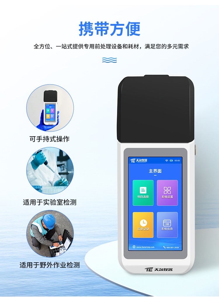 操作便捷性与环境适应性是其突出优势。5寸高清彩色触摸屏直接显示浓度值与吸光度,内置标准化操作步骤指引,新手也能快速上手。仪器支持25mm/16mm比色管检测,内置工作曲线可直接调用,配备标准溶液即可完成快速测定,曲线修正功能还能满足个性化检测需求。在-0℃至50℃环境下均能稳定运行,交直流双供电设计适配实验室与野外检测。