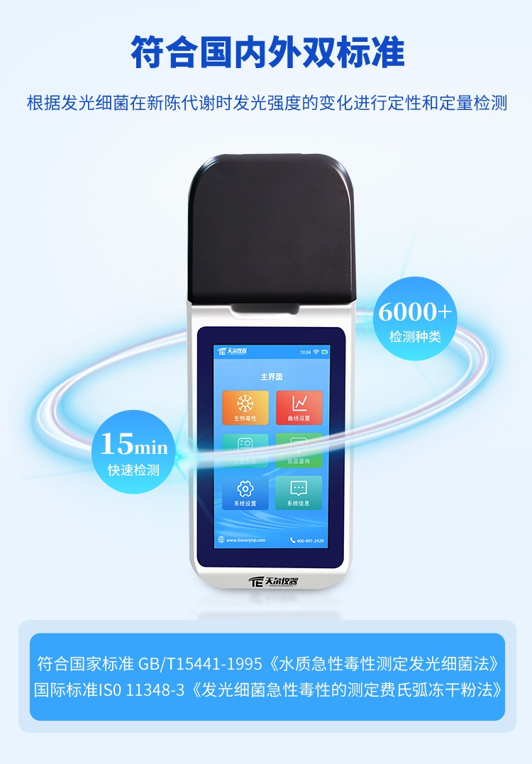 优先选择符合国家标准 GB/T15441-1995 和国际标准 ISO 11348-3 的机型,采用发光细菌法,搭载费氏弧菌、明亮发光杆菌 T3 小种等标准菌种。核心参数需达标:重复检测误差≤1%,可检测毒性物种类≥6000 种,光谱范围 300-1100nm,配备硅光电倍增管检测器,保障检测灵敏度与稳定性。支持 1-20 个曲线浓度点自由设置,提升标准曲线拟合精度。
